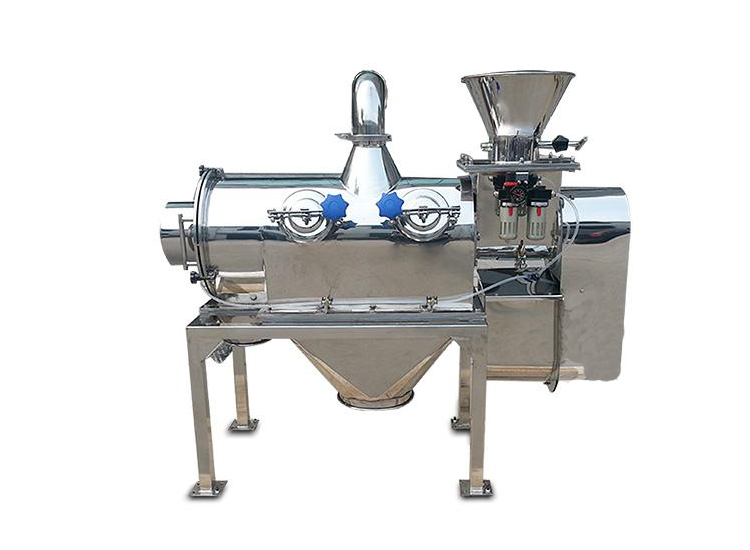 本設(shè)備篩網(wǎng)為圓筒狀,置于機(jī)體內(nèi),物料通過螺旋輸送系統(tǒng)后與氣流混合、霧化進(jìn)入網(wǎng)筒內(nèi),通過網(wǎng)筒內(nèi)風(fēng)輪葉片使物料同時(shí)受到離心力和旋風(fēng)推進(jìn)力,從而使物料噴射過網(wǎng),過網(wǎng)的物料從細(xì)料排出口排出,不能過網(wǎng)的物料沿筒壁從粗料排出口排出,達(dá)到快速分離的目的。